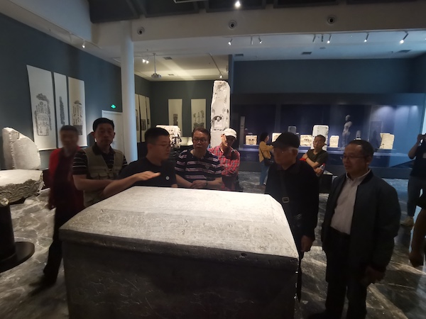 李導(dǎo)對館藏文物了如指掌,從唐代官場、世俗人文、書法文化到民俗,耐心細(xì)致,專業(yè)高端,娓娓道來,令參觀者對大唐文化有了全新認(rèn)識,大家一直認(rèn)為重溫歷史,不虛此行。撰稿員們表示,兩處參觀收獲頗豐,阿房宮看了前殿遺址,弄清楚了阿房宮是徒有虛名的“半拉子”工程。漢唐石刻博物館的精品石刻,其中許多事就發(fā)生在唐長安城,朝代更迭,起起伏伏,令人感慨。我們敬畏歷史,"以銅為鑒,可以正衣冠,以人為鑒,可以知得失,以史為鑒,可以知興替。"在漢唐石刻博物館,一行還提前參觀了明日開展的“慶祝5.18世界博物館日活動拓片展”,令一行收獲滿滿。為表示對此次活動的精心籌劃,陳韜瑞主任向漢唐石刻博物館贈送《新城區(qū)文史資料匯編》,秦航館長熱忱歡迎大家再次蒞臨參觀,共同推進(jìn)民間博物館事業(yè)的健康發(fā)展。