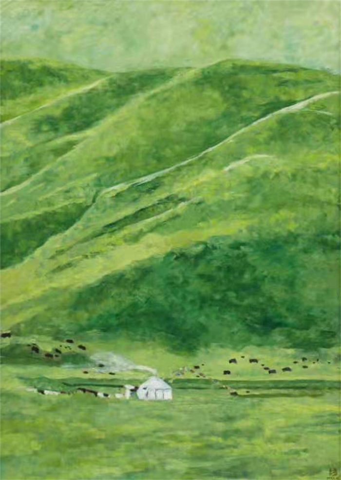 卓圖的作品之所以能帶給人極為強烈的視覺沖擊,首先在于有著非常濃烈而且鮮明的色彩。那《藏風》和《綠野生靈》中那無遠弗屆的深綠,于醉人的遼遠中葳蕤出一種席天幕地的生機,彌漫成晶瑩剔透的夢境。