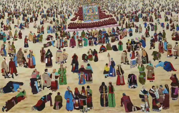當然,最震憾靈魂的還是巨幅作品《曬佛》,匍匐者、站立者、跪拜者、冥想者、懺悔者、禪悟者、獨自而來者、結伴而行者、一步一個長頭虔誠的朝拜者、扶老攜幼紅男綠女闔家禮佛者……有多少人?數不清;多少種表情,算不清;多少種色彩,理不清。但是,震撼,絕對震撼!我想起了馬蒂斯的一句名言:“內在的真實性才是油畫創(chuàng)造的關鍵,油畫藝術,應該追求靈魂”。之所以震撼,是因為它觸及靈魂,更重要的是這幅畫有思想,有境界,有靈魂!看來色彩和人的心理之間確實存在著微妙的聯系,它可以讓人狂躁,也能使人愉悅,能激發(fā)活力四射的精神,也能止息茫無盡頭的憂慮。色彩有情感、有重量、有節(jié)奏、有動力,或響亮或晦暗,或喜慶或悲傷,或陰郁或明朗,或飄逸或遲緩,藝術家正是通過這個載體表達她的發(fā)現,抒發(fā)她的見解,詮釋她的感悟,并借此疏瀹心志,澡雪精神,實現價值追求、境界提升和靈魂凈化。