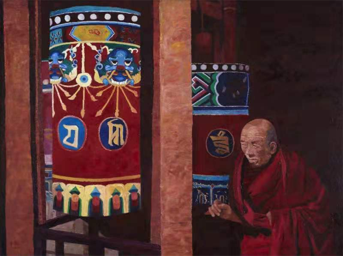 在她心中,最老的最古的最遙遠的就是最神圣。因此,無論是《朝拜》中的內心發(fā)愿,《磕長頭》中的堅貞不渝,還是《轉世輪回》中的熱切期待,《紅墻》外的心有所期,《悟道》中的明心見性,《寺》所體現的偉岸莊嚴,《佛根》中的沉雄練達,《亙古的歲月》里悠長、邈遠的步道,《虔誠的歸來者》那明凈祥和的喜悅,無不透視出一種與生俱來的自然和順,這些畫不是刻意為之的創(chuàng)作,而是從心底里流淌出來的,是從她這棵生命之樹上自然而然生長出來的枝葉,蓬勃出來的健旺,壯碩出來的意識和思想。畫面上有暗喻,有喚醒,有揭示,也有遮蔽。仿佛神祗從四方而來,往八方而去,經過這座村莊后杳無音信。那些上了年紀的喇嘛,眼光大多與眾不同,那眼神中有一種凝聚的力度,吸引著人們去凝視隱匿在他們心靈深處的智慧和冥想。