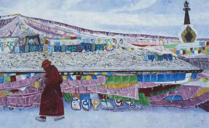 置身于藏區(qū)那種特殊的氛圍,在她眼中到處都是神秘的空白,等著她來書寫,來創(chuàng)造。但如果細思細想,那些瑪尼石、那些經幡、那些巖畫好像是從某個歷史的深處,被一種獨特的敘事音樂慢慢地呼喚出來的圖景,那個時代的文化和精神,那個時代的理想和情操就彌漫在這一幅幅或艷麗華彩或依稀斑駁的圖繪里。