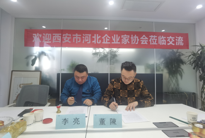 西安市河北企業(yè)家協(xié)會(huì)會(huì)長(zhǎng)李亮,西安市蚌埠商會(huì)秘書(shū)長(zhǎng)董陳分別代表雙方簽署戰(zhàn)略合作協(xié)議。