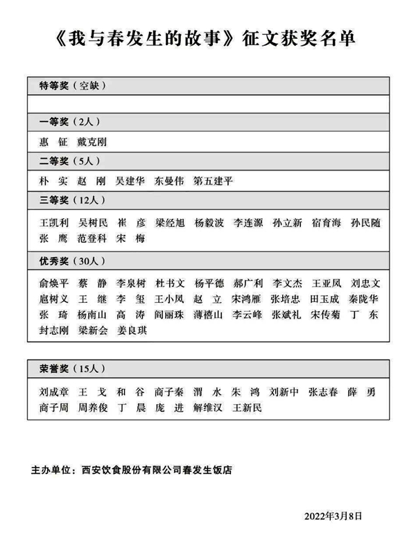 本次征文活動自2021年4月23日開始,2021年6月30日截稿。征文活動得到了社會各界人士的積極參與和大力支持,共收到作品二百余篇。獲獎作品,篇篇內(nèi)容豐富,構(gòu)思新穎,寓意深刻。作者們以不同的角度、不同的經(jīng)歷表達(dá)了與百年老字號春發(fā)生的真實情感和感人故事。部分獲獎作品在報刊雜志和微信平臺發(fā)表后,深受廣大讀者歡迎,并取得一定的社會影響。