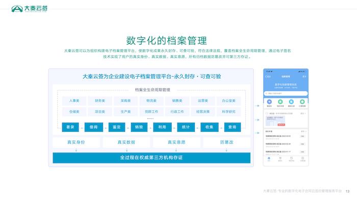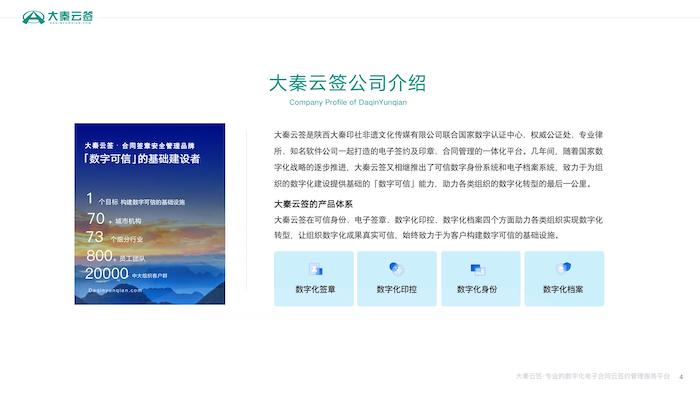 大秦云簽是陜西大秦印社非遺文化傳媒有限公司聯(lián)合國(guó)家數(shù)字認(rèn)證中心、權(quán)威公證處、專業(yè)律所、知名軟件公司一起打造的電子簽約及印章、合同管理的一體化管理服務(wù)平臺(tái)。幾年間,隨著國(guó)家數(shù)字化戰(zhàn)略的逐步推進(jìn),大秦云簽又相繼推出了可信數(shù)字身份系統(tǒng)和電子檔案系統(tǒng),致力于為組織的數(shù)字化建設(shè)提供基礎(chǔ)的“數(shù)字可信”能力,助力企事業(yè)及社會(huì)組織機(jī)構(gòu)和個(gè)人的數(shù)字化轉(zhuǎn)型的最后一公里。 |