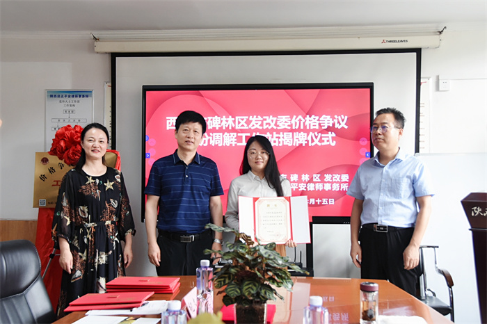 為深入貫徹落實中央、省、市關(guān)于完善價格爭議糾紛多元化解機(jī)制的文件精神,不斷加強(qiáng)價格爭議糾紛調(diào)解隊伍,發(fā)揮律師在預(yù)防和化解價格爭議糾紛的專業(yè)優(yōu)勢和實踐優(yōu)勢,7月15日上午,西安市首例價格爭議糾紛調(diào)解工作站在陜西法正平安律師事務(wù)所揭牌。西安市發(fā)改委價格認(rèn)證服務(wù)中心主任付西京,碑林區(qū)發(fā)改委主任姜芬蕾,碑林區(qū)司法局局長周琦,陜西法正平安律師事務(wù)所主任張平安、副主任王潔等出席儀式并為受聘專家調(diào)解員和特邀調(diào)解員律師頒發(fā)聘書。