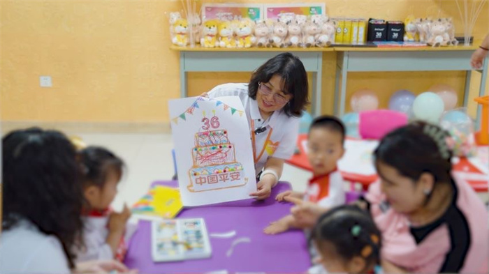 15點15分,“畫筆生輝 共享平安”司慶公益活動正式開始。志愿者們與小朋友們一起拿起畫筆,共同為“36周年司慶蛋糕”填充裝飾出心中的平安模樣。在繪畫過程中,志愿者們不僅耐心地指導(dǎo)孩子們?nèi)绾未钆漕伾,粘貼裝飾品,還盡可能地與孩子們交流互動,走進(jìn)自閉癥兒童的內(nèi)心,讓他們感受到社會的關(guān)心與關(guān)愛。