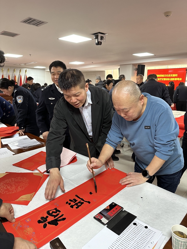 “我們懷著深深的贊許,用手中的筆,向奮戰(zhàn)在交通管理戰(zhàn)線的同志們致以節(jié)日的問候,送上新年的祝福,祝愿大家工作順利、家庭幸福、身體健康、新年快樂!也希望省交警總隊在譜寫陜西新篇章、爭做西部示范中再創(chuàng)佳績!”活動現(xiàn)場,藝術(shù)家老師們揮毫潑墨,以國畫、書法、春聯(lián)等作品,表達(dá)對交通管理部門同志們辛勤付出的感激。