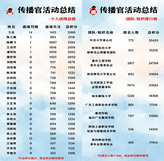 通過他們的共同努力,高立新同學(xué)最終在全國排名中取得了第20名的好成績,組織的團(tuán)隊(duì)在所有高校團(tuán)隊(duì)中排名第九。這一成績不僅代表了陜西工商職業(yè)學(xué)院在此次公益活動中的突出表現(xiàn),也反映了陜西省青年在組織和推動公益事業(yè)方面的實(shí)際成果。