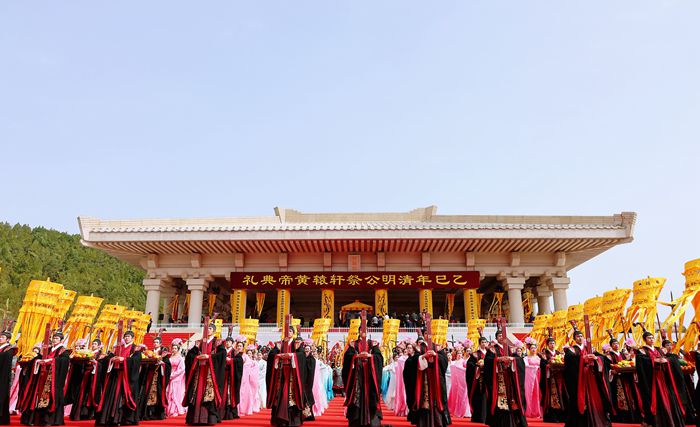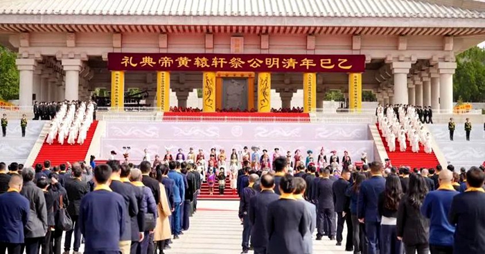 上午九時(shí)五十分,公祭典禮正式開始。全場(chǎng)肅立,擊鼓鳴鐘。擊響的34通鼓聲象征著全國34個(gè)省、自治區(qū)、直轄市、香港、澳門特別行政區(qū)和臺(tái)灣地區(qū)以及海內(nèi)外中華兒女崇敬初祖的共同心聲;9響鐘鳴代表了中華民族傳統(tǒng)禮儀的最高禮數(shù),表達(dá)全體中華兒女對(duì)人文初祖軒轅黃帝的無限景仰和無比感恩。