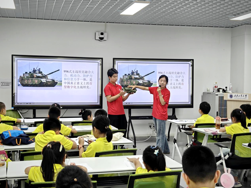 活動圓滿結(jié)束之際,實踐隊的成員們特意為在場的孩子們精心展示了兩件備受矚目的軍事裝備模型——殲-20戰(zhàn)斗機與99-A式坦克的精細復制品。在宣講隊員細致入微、耐心周到的指導下,孩子們近距離觀賞了這些模型的精致細節(jié),并且親手觸摸其外觀,通過這種直觀而生動的方式,深刻地理解了這些先進武器裝備的復雜構(gòu)造及其背后的科學原理,極大地激發(fā)了他們對國防科技的興趣與熱情。