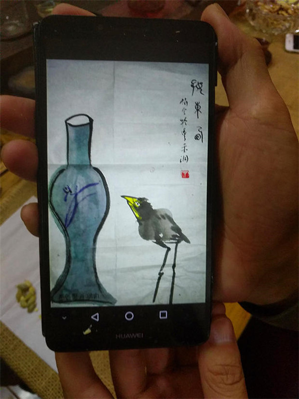雖然病痛纏身,丁老思路清晰,語(yǔ)言簡(jiǎn)練,常常一語(yǔ)中的。他不時(shí)從手機(jī)中找出自己的作品讓我們翻看,有治印、賞壺、書(shū)法和畫(huà)作,真乃一通百通。他治印古樸雅致、遒勁厚重,被國(guó)家博物館及國(guó)家領(lǐng)導(dǎo)收藏。丁老雕刻作品師承古法,自成一體,常常令人喜出望外。比如他自己的一個(gè)“丁”字章,四周磚紋(云紋)裝飾,中間一個(gè)僅一個(gè)“釘子眼”,謂之丁,大繁至簡(jiǎn),機(jī)智風(fēng)趣。一方為藏克家雕刻的“上下求索”圖章由右向左文字列為三排,逐排漸長(zhǎng),寓意求索不是一朝一夕,有可能數(shù)代百年,其下方留白為神來(lái)之筆。